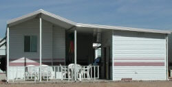 built off the front of a mobile home. Under the awning a