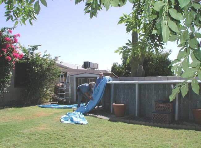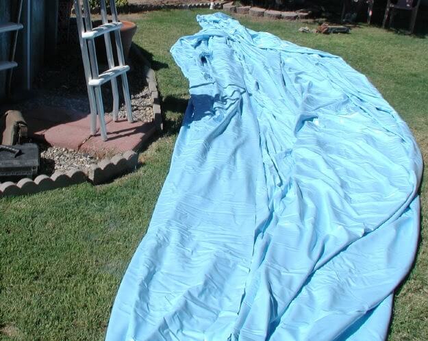 When the pool is ready you should unroll the liner on a nice grassy area or a freshly swept driveway. If the pool is an oval locate the two ends and pull the liner tight. With a round pool there is no end to end. Now fold in the sides and make it look like a big, long cigar. Before you take this to the pool make sure all of the rough edges and sharp points on the pool have been well taped. We use a lot of duct tape to keep the pool framework from tearing the liner. The pool in the photos is a Doughboy brand pool, designed for this type of installation where no taping is required except maybe holes drilled thru the top rail to mount the ladder.