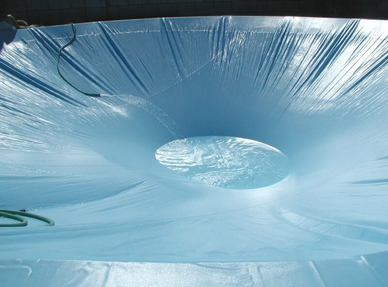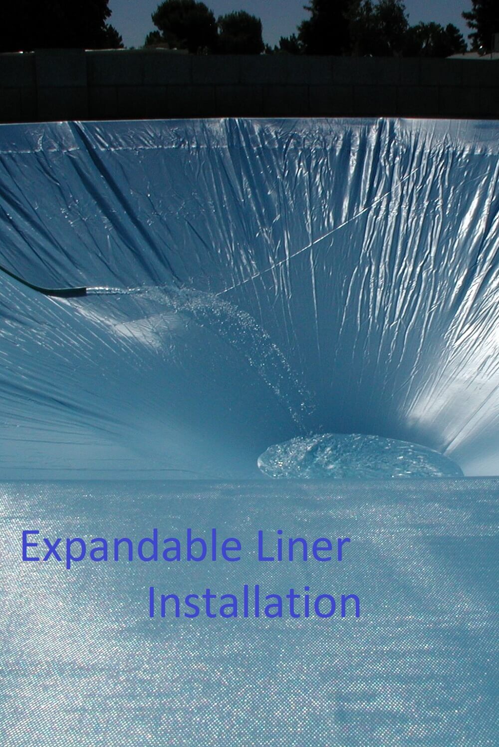In the expandable liner installation photos below we are carefully lifting the liner into the pool and starting the process of pulling it up and over the top rail. The last photo shows all but the last rail pulled over.
