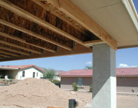 This front view shows the fascia board installed to blend into the home. The only thing different here from an attached wood awning are the beam and posts next to the home. Once these have stucco and paint they are hardly noticed. On a residential home the header board and rafter hangers can be attached to your existing framing.