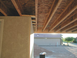 These are photos of a basic wood awning as well as some tips for how to build wood awnings. This wood awning is built next to a modular home. Our area building codes require that the awning not be attached to the home. In the final out come you would not know it is not an attached cover. These are photos of the project after our wood patio cover was installed. Next, the dry wall crew came in and hung the ceiling. Then the entire unit had stucco applied. After the stucco, the painters came in. We left the roof bare OSB. The roofers came and installed felt paper and shingles to match the roof of the home. The wood awning has now become tied into the home and does not look like an add on.