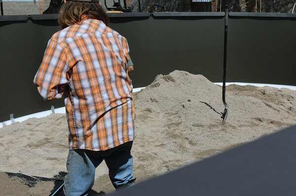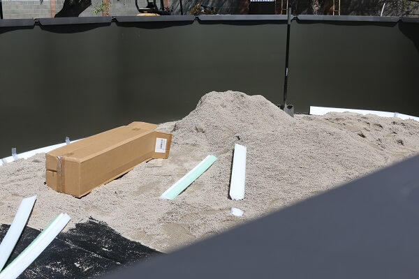 While the sand is being brought in the foam cove is being installed. If we had brought the sand in our usual way, with wheel barrels, the sand would be lined up in the center of the pool from end to end, a good distance from the side rails. This allows for an easier installation of the pool wall and everything else we may need to do before we are ready to use it.