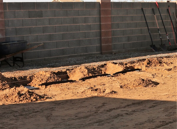 This pool has four braces on each side that sit about 41" apart, center to center. My center screwdriver will show me the center of the two middle braces. Knowing that and using the string line I can begin to dig the trenches. There is a block set in the back of each channel. The top of the block and the trench itself need to be exactly 2" below my pool grade level.