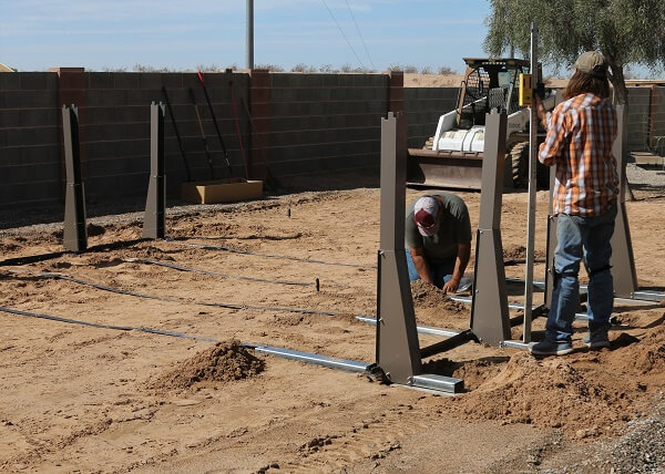 The trenches are dug, I am double checking level while the straps are being connected and all the bolts tightened. I leave all the strap bolts loose until this step. It is easy to tighten them earlier only to find out they are not straight. With everything square, straight and level they get tightened and all the backfill begins.