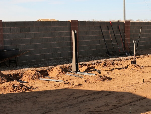 This is the wall going up and the pool being assembled. Never, ever do we have a wall completely installed without support. They blow over too easy.