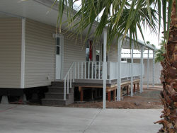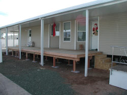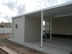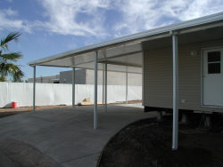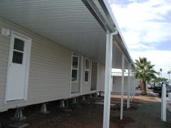 These are pictures of a mobile home we worked on. We started with the awnings, a patio cover and a carport cover. Under the patio cover we installed a deck and under the carport cover we installed a shed. The finishing touches will be to continue the vinyl siding to the ground around the mobile home and deck.