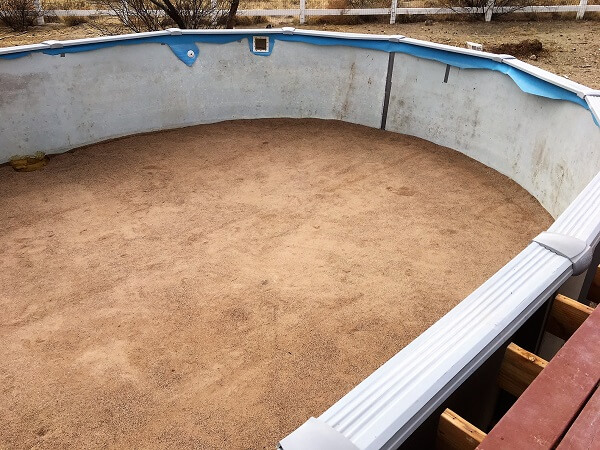Next, it is a good idea to get inside the pool and remove the liner. Do not take the pool apart. Just use a razor blade and cut the liner out a few inches down from the top rail. To make removing a large liner from a pool easier it may be necessary to cut the liner into thirds or fourths. Once the liner has been removed you can check the pool base and side walls. If you have a sand base with some sink holes a couple of bags of play sand from a nearby hardware store will usually be enough to level them out. If the bottom of the pool is full of tree roots they should be removed. If doing this messes up your pool base you may need some more sand to smooth it out. If there are grass and weeds present pull them and treat the area with a grass and weed killer. You should also check the pool wall very closely for any signs of rust. Rust spots should be sanded and painted.