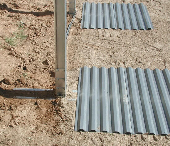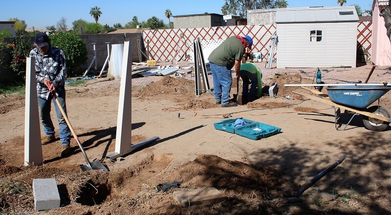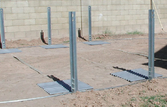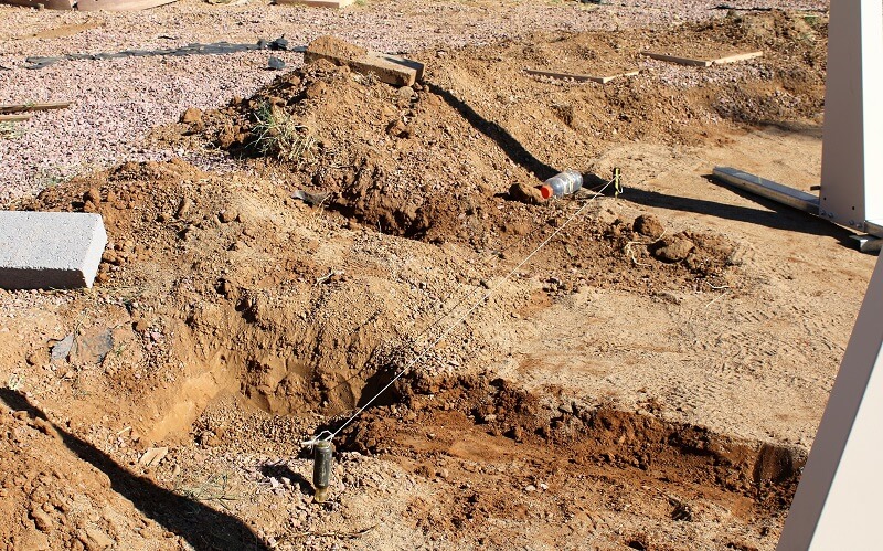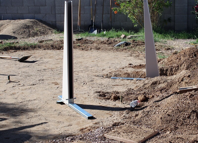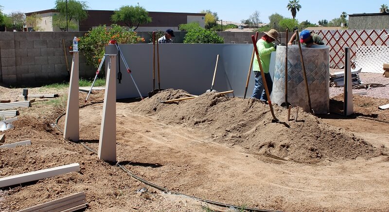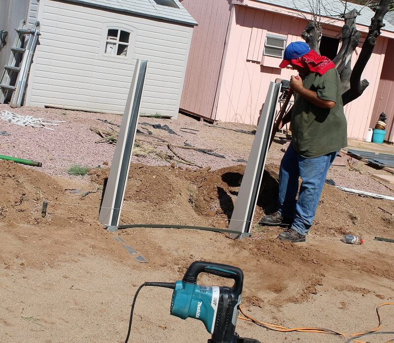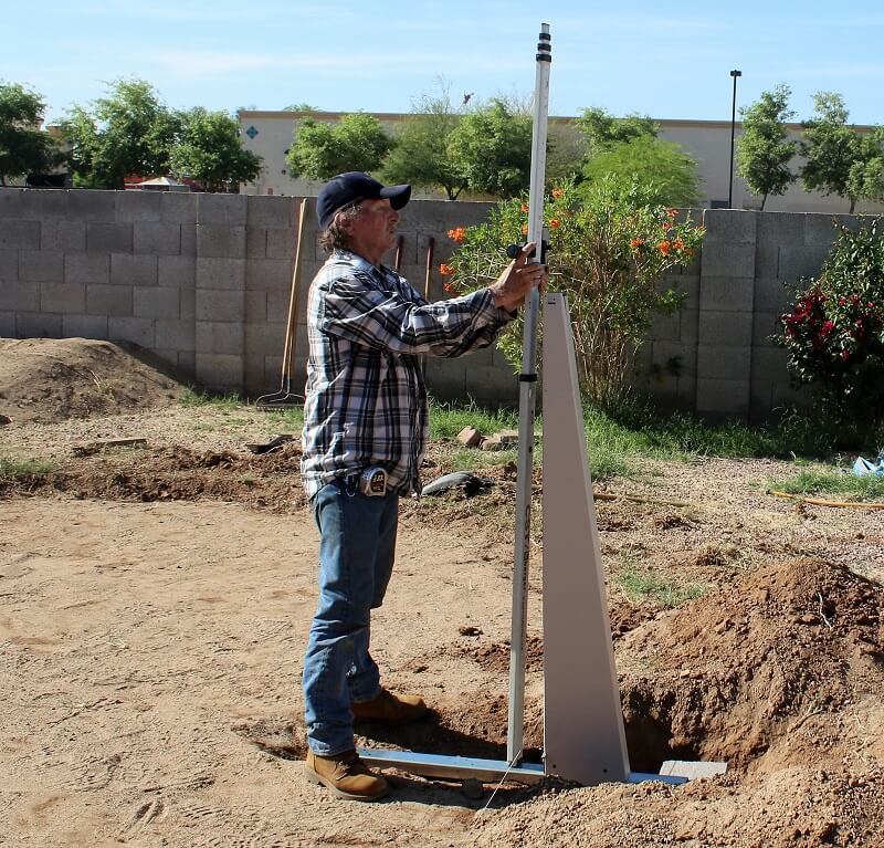We are working today in Phoenix Arizona. The start of this job was removing a very old pool the same size as the new 16' x 24' we are working on. The side braces need to be set in the ground deep enough so that the bottom rails rest at ground level. The back needs to be deep enough for a concrete block to sit against the L bracket attached to the bottom of the brace channel. My string line is in place so I know exactly where to set the braces.