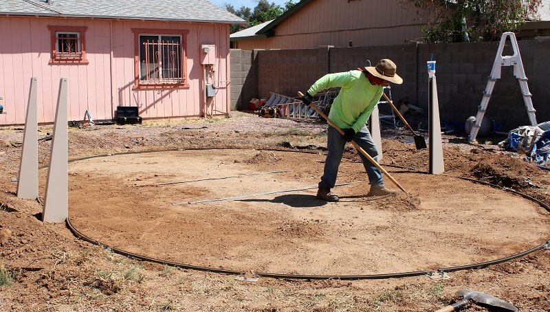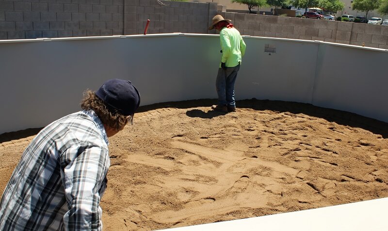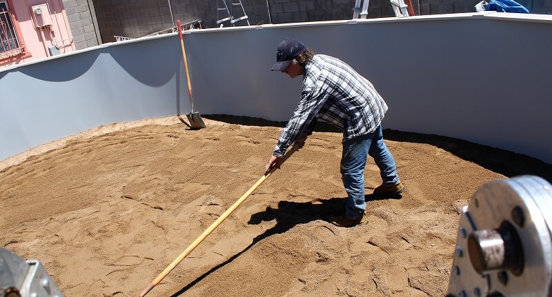 With the pool up and everything looking good, level everywhere and straight sides it's time to spread the sand. With that done we do some foot stamping and start the smoothing process.