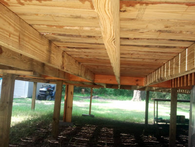 The structure starts with the 4 x 4's and resting on them is the key to a strong deck. They are 4 x 8 purloins. On top of the purloins is a frame made with 2 x 6's on 16" centers. On a pool deck we would use 2 x 6's on top of this frame, for a mobile home deck where we plan to use carpet we use plywood.