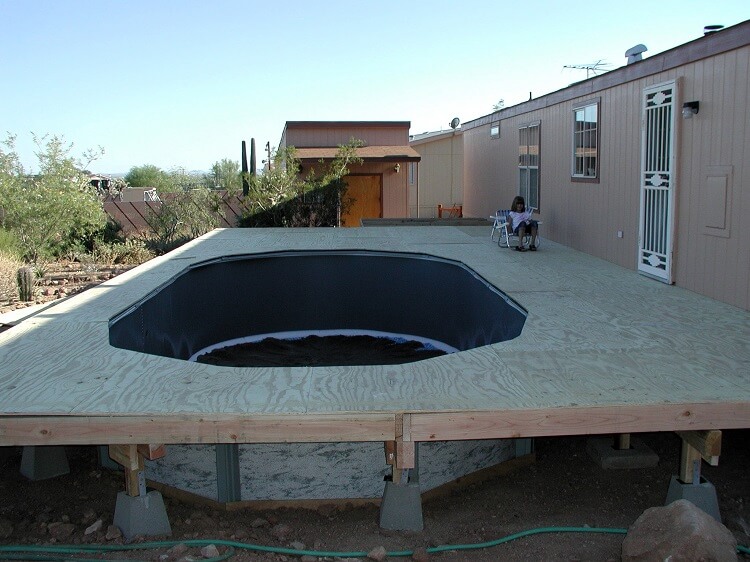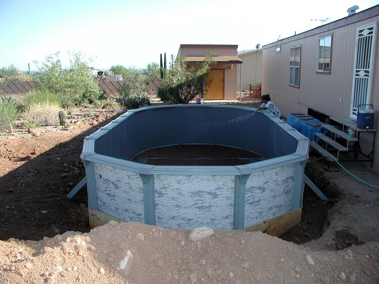 We have started adding dirt around the pool getting ready for the deck to be installed the next day. Hopefully all my measurements were correct and the deck fits just below the back door.