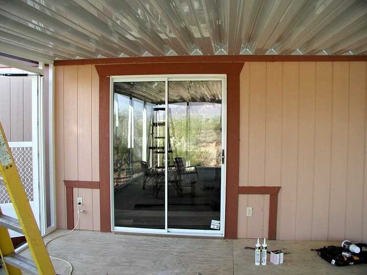 The window has been replaced with a sliding glass door and trim added around it. The decking had to fit this area perfectly also, thank goodness for the constant use of a laser level.
