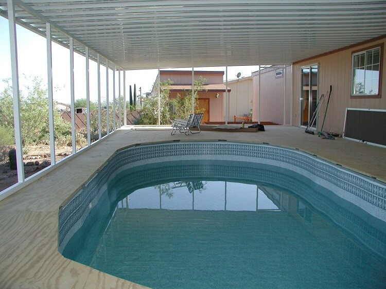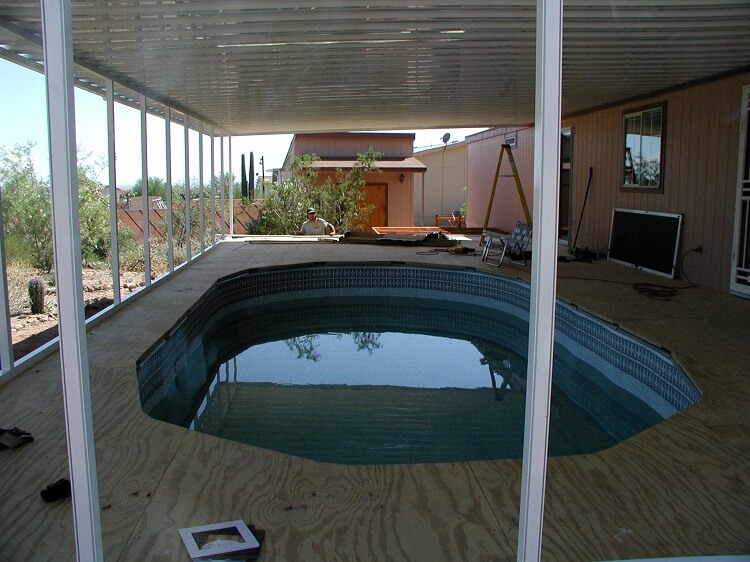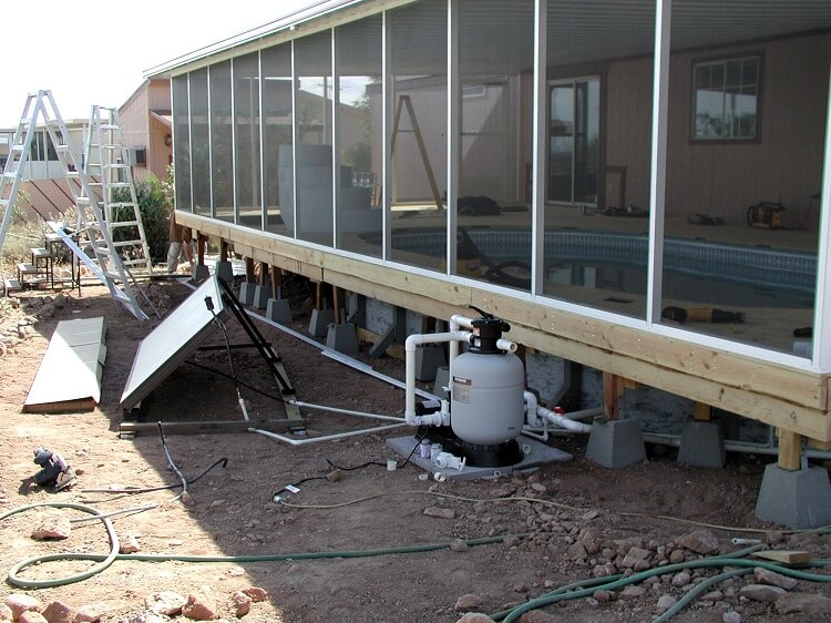 The plumbing is done, a solar panel hooked up and the screen has been installed in the room screen walls. The solar panel was given to the customer by a friend and he later found out it was not adequate in size to heat the pool. Being under this much shade it needed more. Later they had one side of the roof covered in panels and the pool is comfortable year round.
