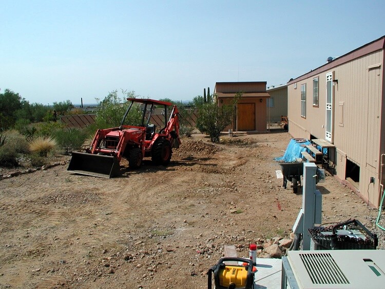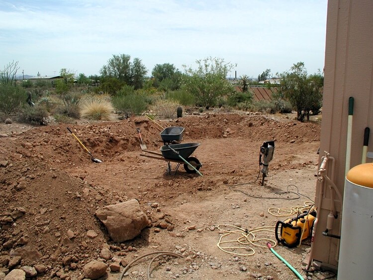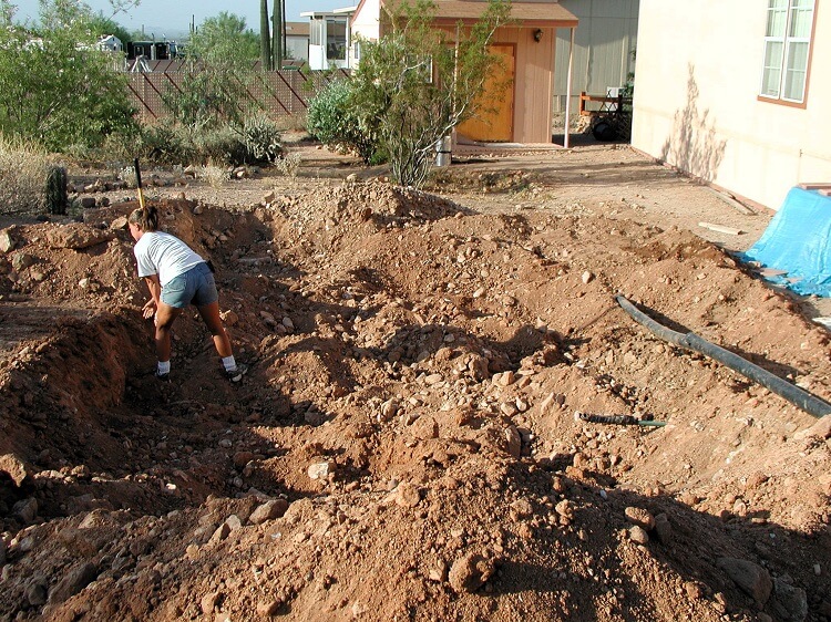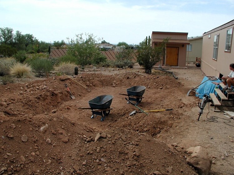 Part of the reason for leaving so much manual work was because of the close proximity to the modular home, I did not want to disturb the foundation in any way. A couple other issues came up like the old gas line and a sewer pipe. So because of some unforeseen problems and very tight working quarters I felt more comfortable finishing the hole by had, just me, my wife and a jackhammer.