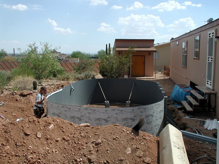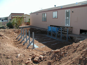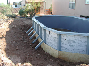 Here the brace assemblies are set, you can see the tight clearance between the braces and the steps coming off the back door. A lot of measuring went on in this process. The height of the finished pool needed to be lower than the door by enough to allow for decking and carpet. Perfectly level was also a must but I do that with all my pool installations. The braces also had to be perfectly square with the home. There was a lot going on at this stage.