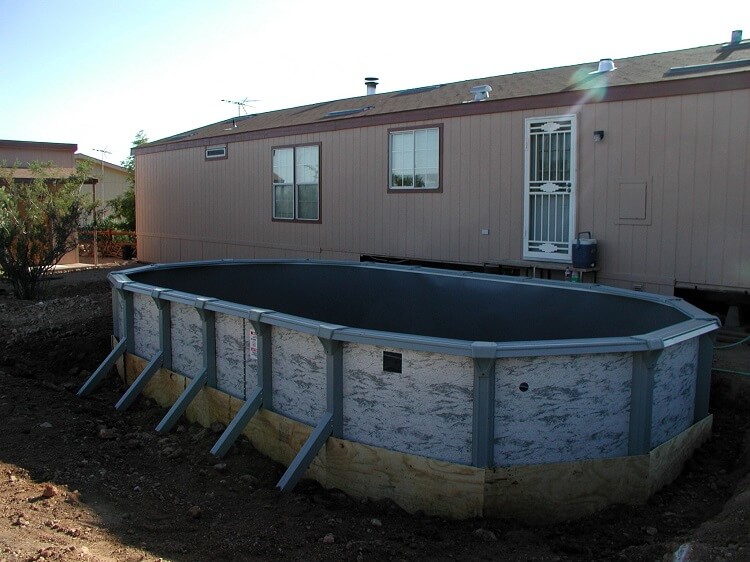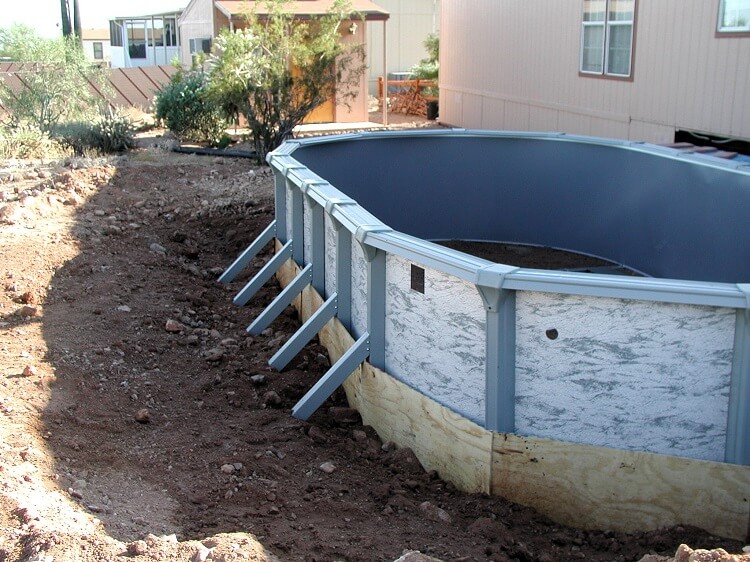 Knowing a lot of that dirt needed backfilled before the deck could be installed I built a wood boarder around the lower part of the pool. This would allow the pool wall to stay up without caving in because it would be a while before there was water in the pool..