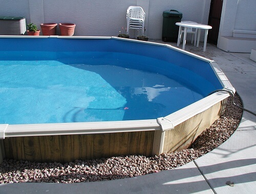 The photo above shows a pool with landscape rock around it. It looks nice but not good for liner changing time. All the rock would need to be removed before the pool could be emptied. Once the rock starts slipping down behind the wall you have major problems.