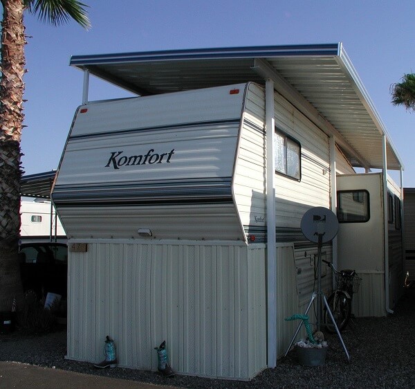 The awning panels are made in several gauges for different wind and snow requirements. Aluminum awnings can be anchored to an existing concrete slab or safety stakes and concrete can be used to anchor in the ground. The posts used with these awnings come in several styles and gauges.
