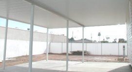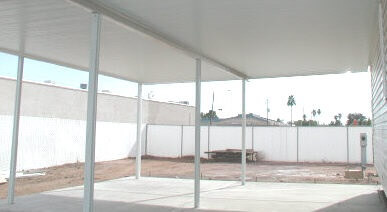 I beams are used a lot with aluminum awnings. The most popular uses are that of a set back bar or for the purpose of creating a greater distance between post. Aluminum awnings can have an overhang off a set back bar of up to 3'. 1' to 2' is more the normal distance but with heavier gauge panels the 3' distance can be obtained. This is a big help if you want a 12' projection awning over a 10' slab and want the awning slab mounted. Use an I beam as a set back bar and attach the posts to the concrete slab. The awning would then overhang the I beam by 2'. The gutter would be mounted at the end of the panels and the downspouts attached to the posts. Elbows are used to bring the downspouts from the gutter back to the posts.
