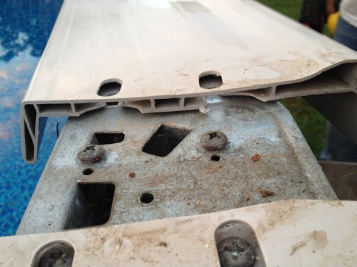 After removing my winter cover , I discovered that 1 end of a section of my resin top rail was pulled out about an inch from under it's corner cover. After removing the corner cover I discovered that the top rail mounting slots had been broken out at the ends of the slots.