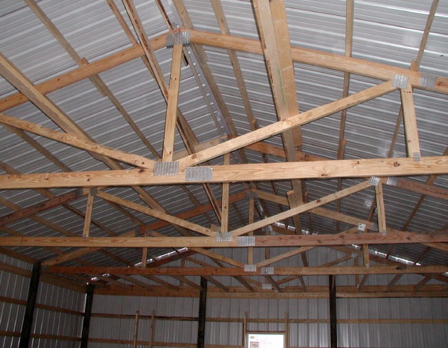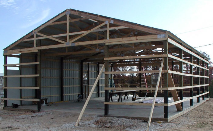 We started building a pole barn on this page Pole Barn. Here we will show more views of the construction and the inside framework. One of most important things you can when working on a project of this size, keep everything square. No matter what you are doing, keep it square and double check often.