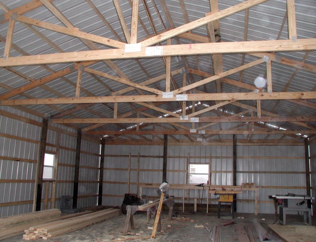 Building the pole barn in Missouri, with winter fast approaching, can mean working in some pretty nasty, cold, windy weather. Once the roof is on we at least have some place dry to do the rest of the cutting, if needed. I prefer doing this outdoors, but there are those times it's nice to be inside with the propane heater cranked up.