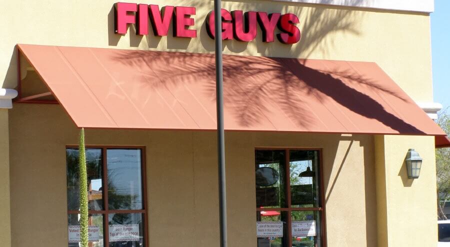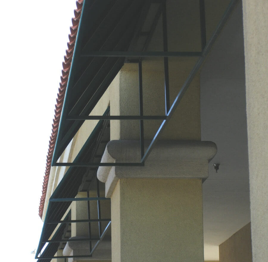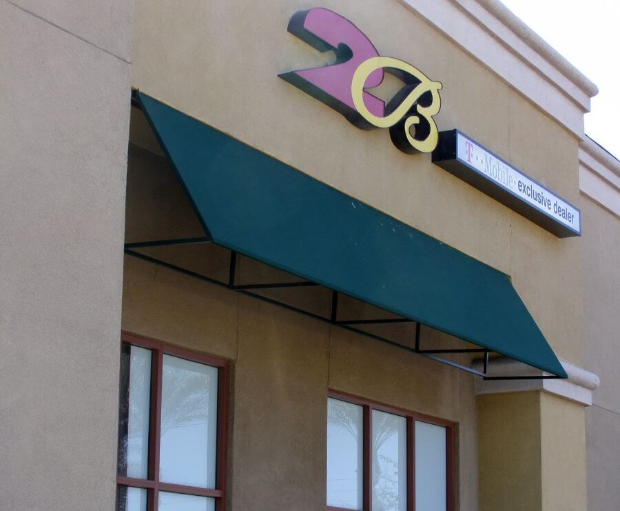 This set of photos will show you that there are no rules when it comes to commercial window awnings. Steel can be fabricated into any shape you desire and the cover can then be made to fit the frames. Attaching the frame is as important factor to consider when designing this type of frame, the more flat surface you have to mount brackets the better.