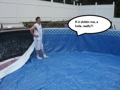 At that time of day pool city was closed. Our intent was to get the liner in that day as the next day it was going to rain. So, since we couldn't do anything since Pool City was closed, we put a piece of duct tape over the hole and let it rest till the next day.