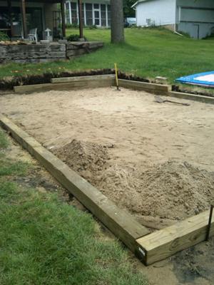 The excavator said that he could only get it level with sand and that I should have done it that way to begin with. (OK you're the expert why didn't you tell me that on the phone? was my question to him) So I hired him again to bring in 2 inches of sand....we'll he overestimated and ended up dumping 8 yards or about 6" inches of sand in the hole and "leveled" it with a rake. (another $200) When I set the pool on it (we assembled the pool off to the side and had about 8 people lift it into place) it was immediately apparent that the pool was out of level by about 4" from near side to far.