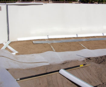 You could also remove the sand from the cove area and install the preformed cove. At this point you could try to level the existing sand out to a point just a little below the half way point on the cove. This would leave the top half of the preformed cove exposed. When you lay the foam pad down it could then be taped to the coving. Or it could cover the cove and be taped to the wall, it really does not matter, it looks nice either way.