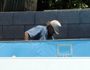 You would pull a few top rails and release the liner, just enough so that you could climb over the top of it and get underneath it. Once you are underneath someone needs to pull the liner back over you leaving you in darkness. You will now start crawling around the outer edge of the pool. This is normally where the holes will be found. At some point you will see light shining through the liner. That would be your hole.