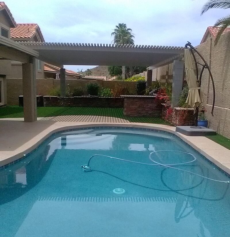 More expensive shade for your pool could be some nice Aluma Lattice, a retractable awning or an aluminum awning. Dome and shade screen structures also offer protection from the sun. The pool below was built first and then the deck, screen room and awning were built around it. This gives maximum pool shade and a lot of protection from bugs and other elements.