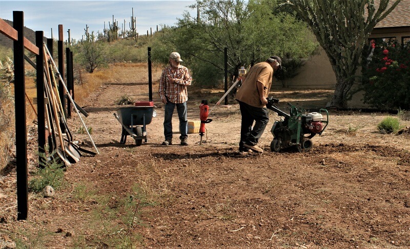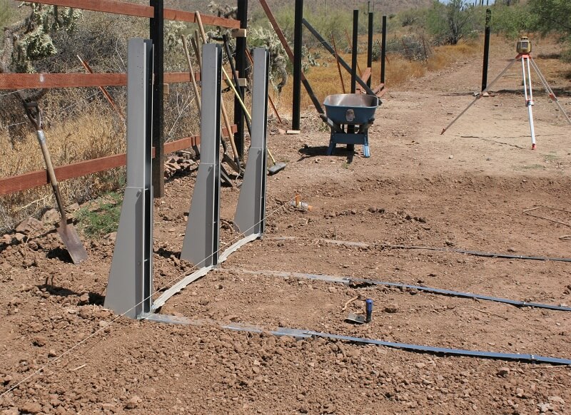 While the braces are being built I lay out where the trenches should be dug and start the digging process. The trenches are only 2 inches deep with another 2 added in the rear for the block, but in this ground it seemed like a foot for each one.