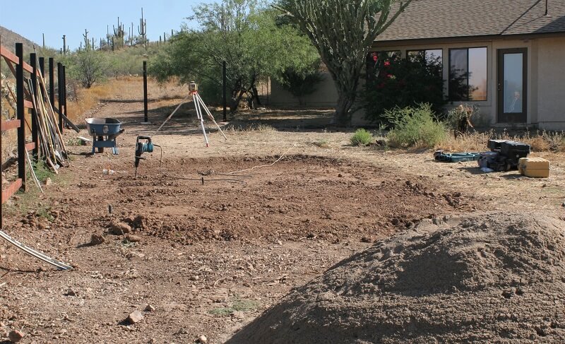It is hard to tell from the photos just how far off level this pool area is but with the laser set up we find it is nearly a foot from end to end. This is a mountain side location and the ground is more rock than dirt and even after a good dose of water the sod cutter would do nothing to cut through it, so out come the jackhammers.