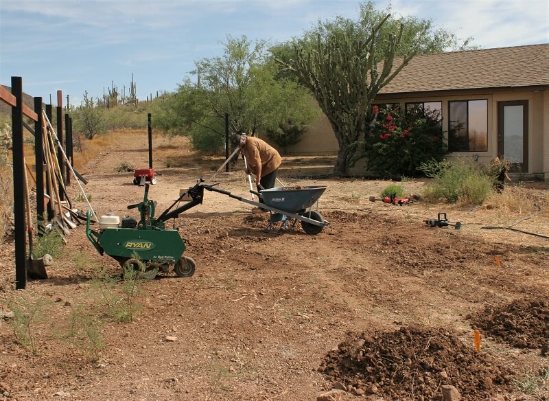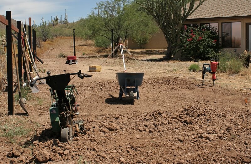Our method of leveling would be to loosen the ground with the jackhammers and then run the sod cutter over the area to cut the ground into smaller pieces that would be easier to shovel into the wheel barrel. The dirt is then taken to the low area, spread out and packed into place. This goes on over and over again until the high end is cut down low enough.