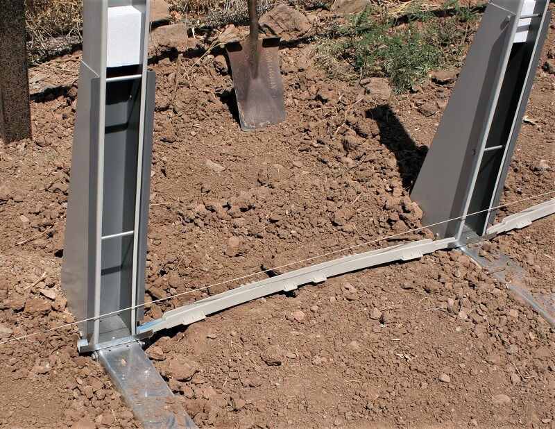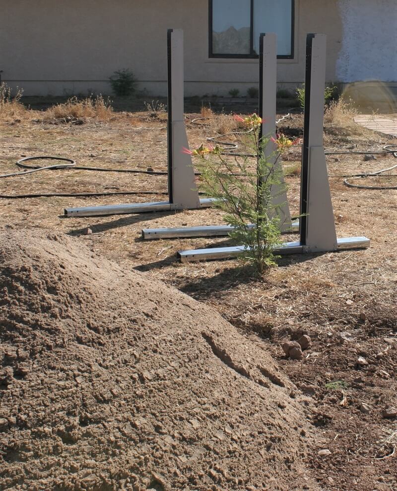 This is where I deviate from the instructions. First, I use the foam pieces inside the uprights instead of the channels, either way is fine but this way keeps the top bolt from being over tightened and squeezing the upright. I also set one side completely against a string line before proceeding to the other side. Once the first side is set, straight and level I connect the straps and lay out the other side. The opposing side is then connected to the straps and squared with the set side before any digging takes place.