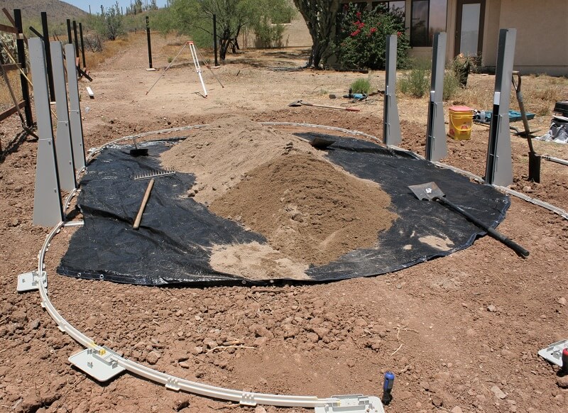 With the end rails in place and leveled we start moving in the sand. I normally do not use a ground cloth but I thought the ground conditions here would benefit from one. The sand is piled in a line down the center of the pool and gets spread out and smoothed once the pool wall is up. We always level with firm dirt, never the sand. We also don't want that sand anywhere near the bottom rails until the wall is up. It can be hard enough getting the wall into the bottom track, even harder if it is full of sand.