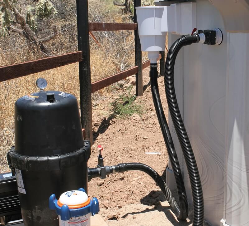 Before we leave we make sure the skimmer and return are installed and the filter assembled and hooked up to the pool.