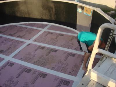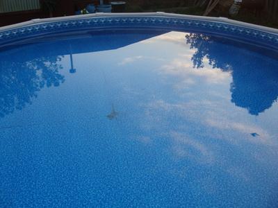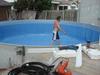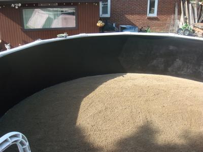 We removed the 1 season liner since rust was on the inside of the liner , waited for a hot 93 degree day and bought a new J beaded liner. My hubby knocked all of the rust off the walls, patched a couple of through rusted small holes, rust proofed the walls with roll & hand brushed on rustolium, let it bake in the sun, put weed thru paper on the wall with spray adhesive and new cove, re-spread the sand base and re-did the styro bottom that he custom made (in place of happy feet).