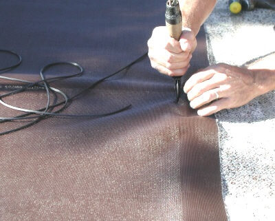 We use a rolling device like the one pictured to roll the screen into the frame without the spline. This seats the screen and makes rolling in the spline easier. Next you start at one end and roll the spline into the grove over the screen. We only partially seat the spline the first time over. We use the sharper side of the roller to firmly seat the spline the second time across.