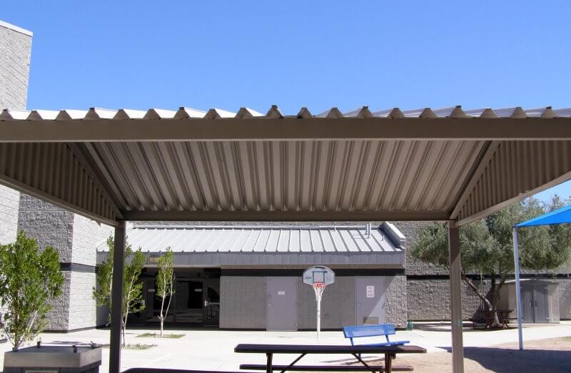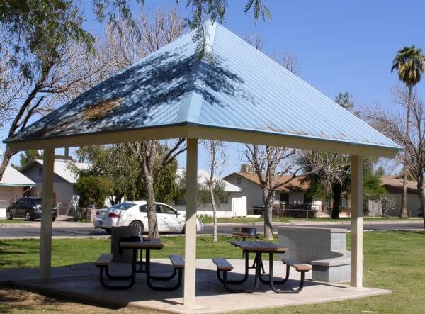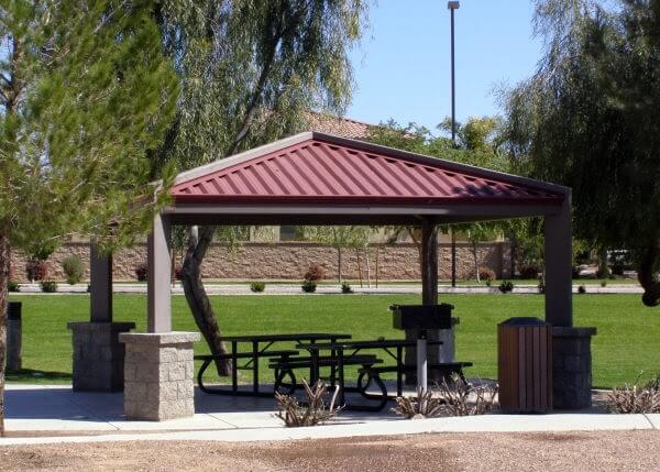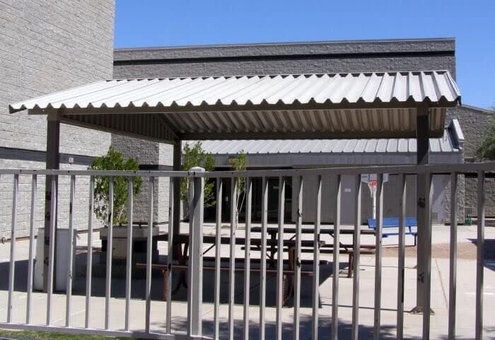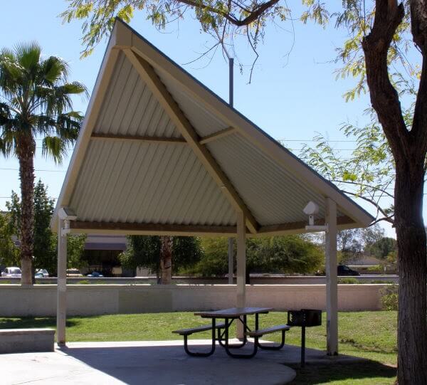 The more traditional steel type awning structures are still popular. The steel panels have become almost as colorful as the fabric making it easy to match or enhance any nearby building. This structure is at a small park and provides rain and sun protection for a picnic table and grill.