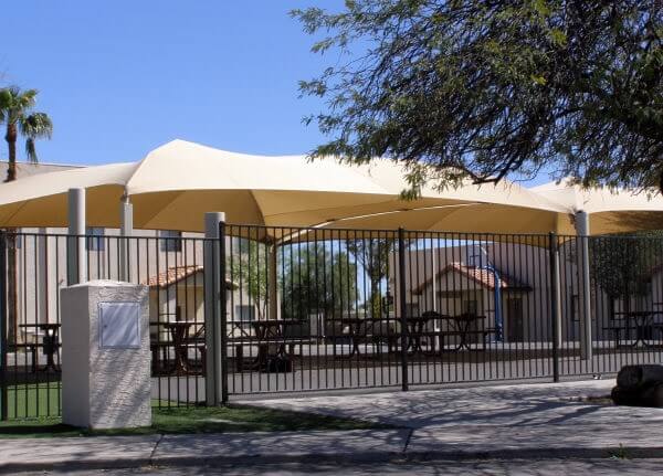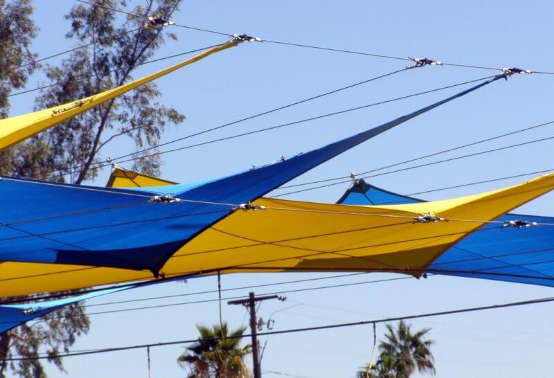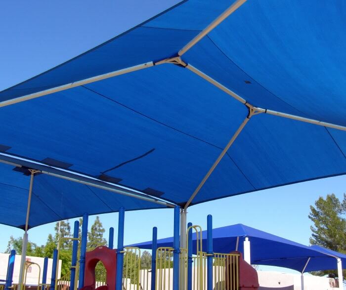 These bright blue shade sail type shades are a colorful way to decorate a play ground area. Keeping the kids out of the direct sunlight is becoming an important consideration for playgrounds and schools and this type of shade structure does an outstanding job of offering shade and great looks.