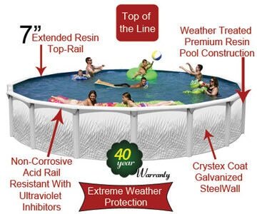 This pool features a very nice 7" resin top rail and the incredible 40 year warranty. They have galvanized steel side walls with the new Crystex coating to assure you the pool will live up to it's warranty.