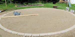 The sandy soil that is used for the pool base should be watered and packed as best possible. All of the bottom connectors should be set on blocks and the blocks all leveled. Using a transit or laser level to level the blocks is very helpful. The sand that will be spread out for the base should be piled in the center of the pool and only spread out after the wall is up.