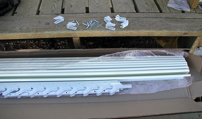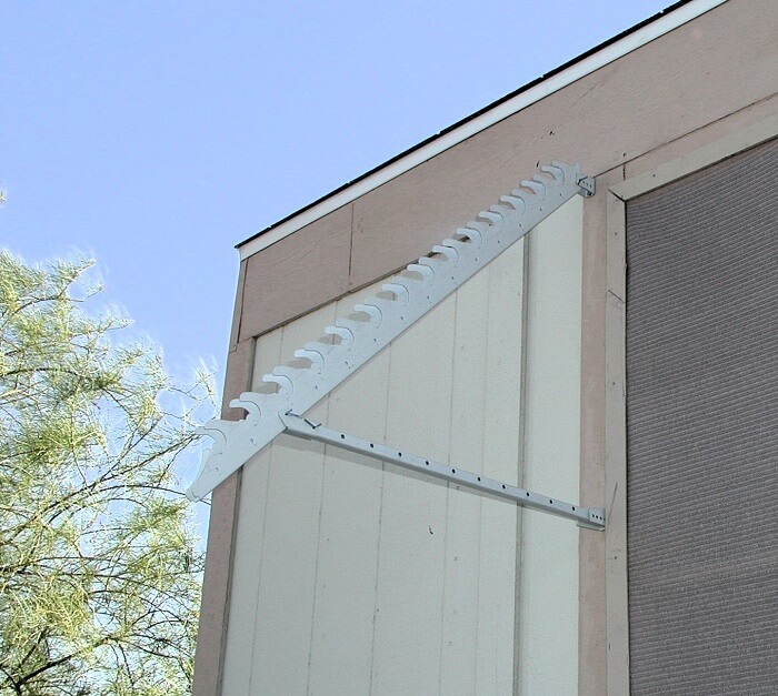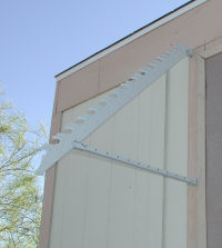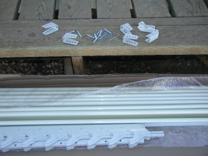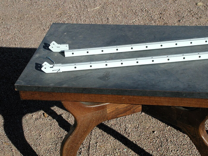 Attach a stringer into each top bracket using the cotter pins provided. The brackets have multiple holes. I use the outside hole most of the time. Your situation may require a different set of holes. Some awnings may have more stringers and support arms. If you are covering multiple windows space these between them. If it is one big window use the stringers without the support arms. Your awning may come with three stringers and two support arms, in this case the middle stringer just needs to be centered. At the bottom of the stringers the valance holder needs to be installed prior to attaching to the brackets.