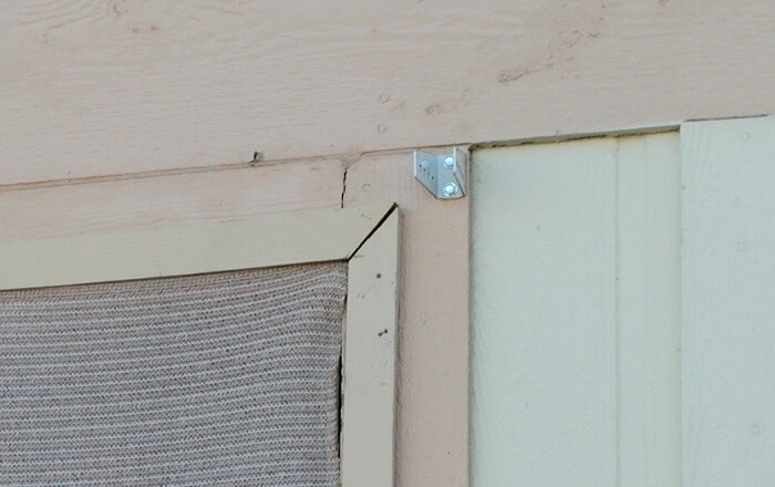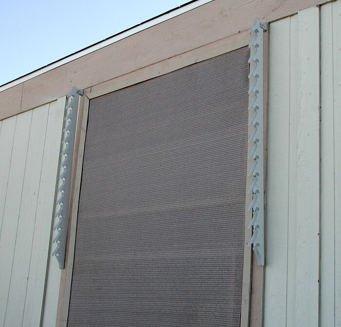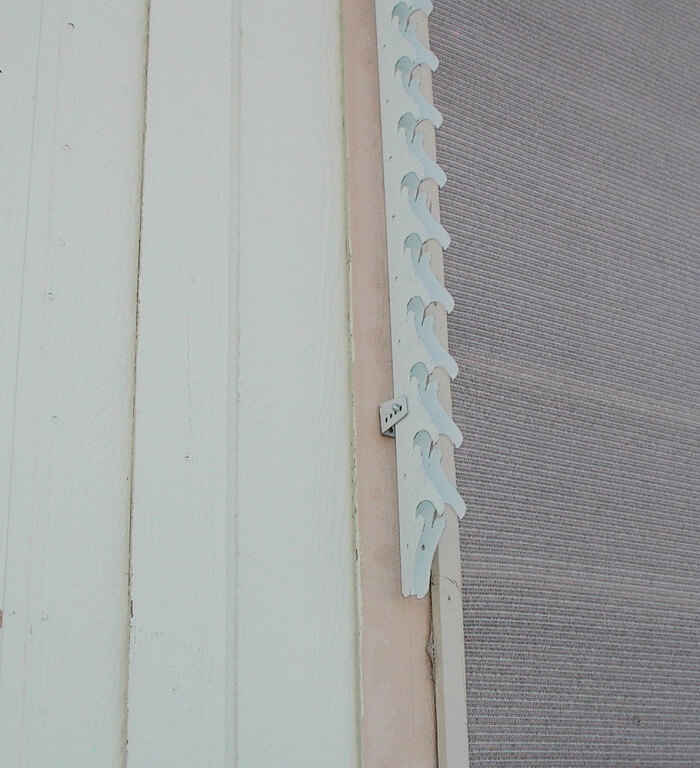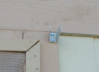 The first step is to attach the top brackets. They belong at the top corners of the window and are held in place with 11/2" sheet metal screws. If the window has an aluminum frame that is exposed these clips can be installed right over the frame for extra strength. Small windows like this one require just two clips on top. Larger windows will require more clips to be installed.