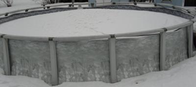 The only problem with that is if any water gets behind the liner it could decide to all come out at once causing some structural damage to the pool. To prevent this from happening you would need to drain the pool before the ice melts. Could you drill through the ice and use a garden hose to start a siphon?